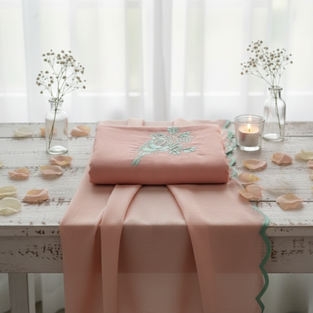 The Pastel Whisper unstitched suit set represents a flawless fusion of serene color palettes and traditional craftsmanship. Crafted from premium Mul Chanderi fabric, this material offers a lightweight, breathable feel with a luxurious silken sheen. We designed this set for the woman who appreciates the fine balance between comfort and high-end sophistication. Because the fabric comes unstitched, you have the complete freedom to tailor the silhouette to your exact preference. Whether you prefer a classic straight-cut kameez or a modern flared style, the soft peach base provides a stunning canvas for your personal fashion statement.